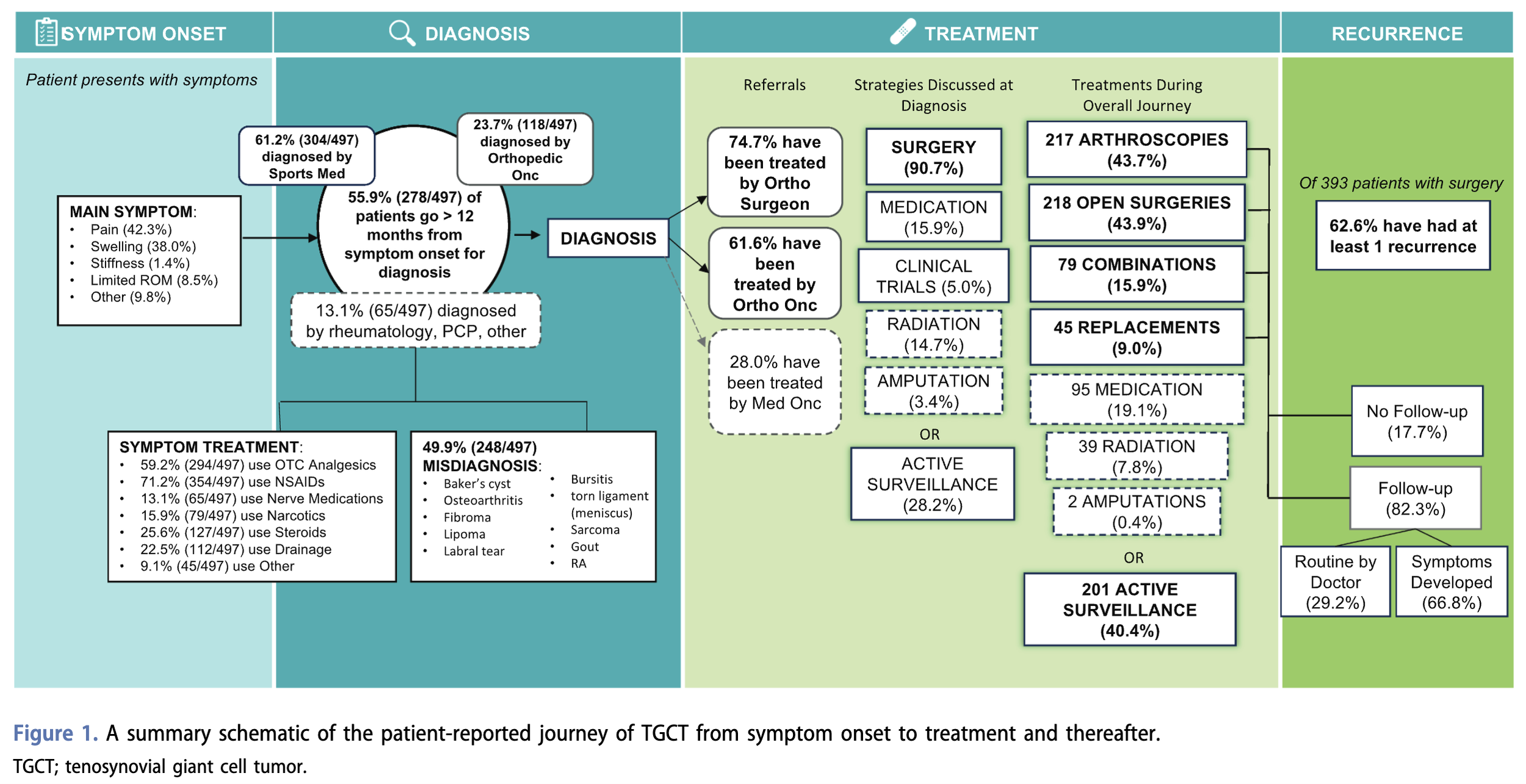 TGCT is a rare disease, and with better understanding of the disease and emerging treatment options, the standard of care is rapidly changing; this manuscript presents the largest ever analysis of patient outcomes, with a cohort of nearly 500 respondents.